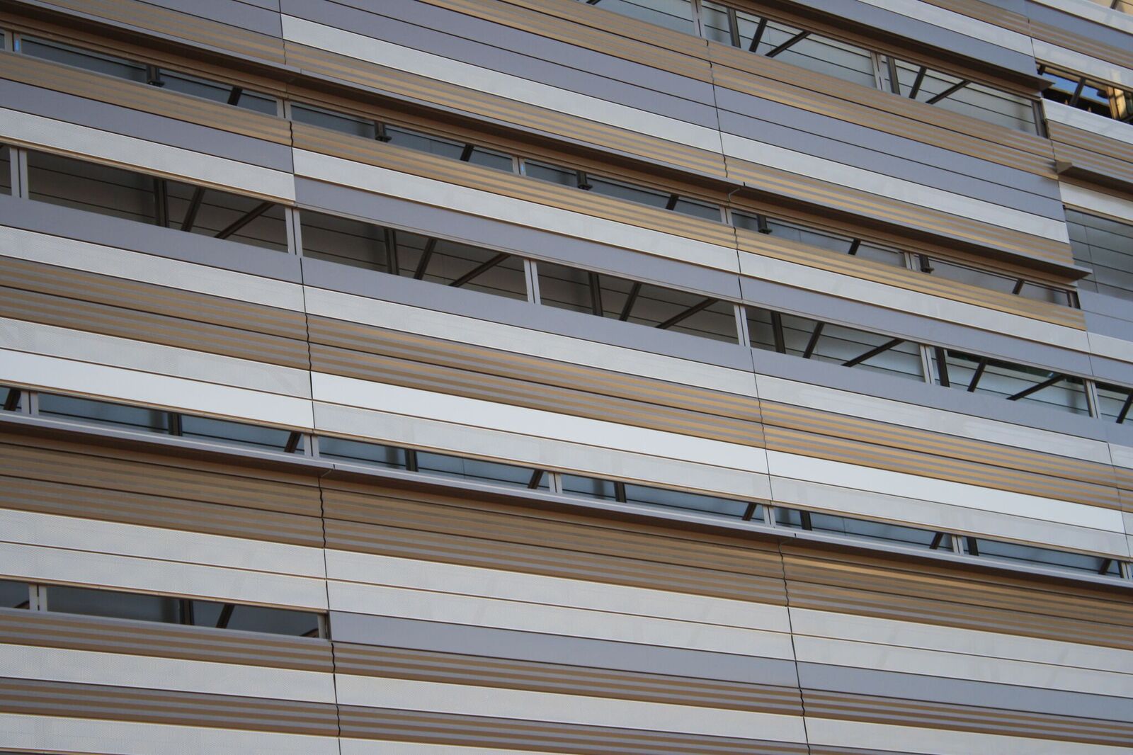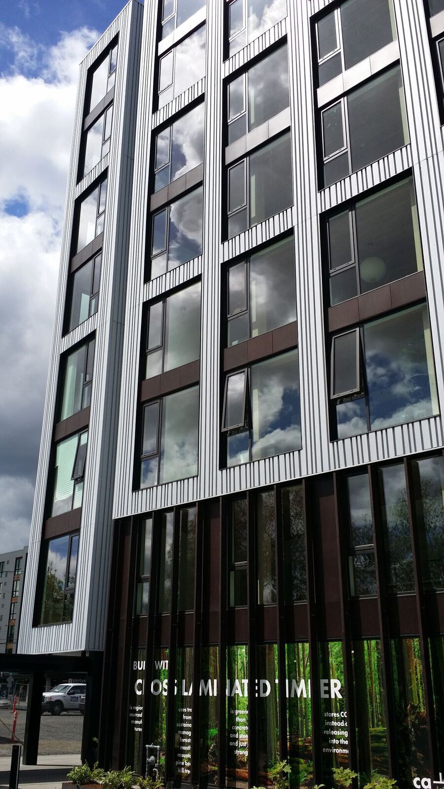 Carbon12 is a groundbreaking building that sets a new standard for sustainable development. At 85 feet tall, this is the tallest mass timber and cross-laminated timber building in the United States. The use of light-weight and sustainable materials include the aluminum wall panels, which feature OCM’s “K5: White Rust” finish. In addition to being light-weight, the aluminum that covers the entire structure is 100% recyclable. The “K5: White Rust” finish protects the aluminum while adding the appearance of a lightly-weathered, natural metal which complements the exposed timber seen throughout the interior. Upon request, OCM can provide 100% recycled aluminum.