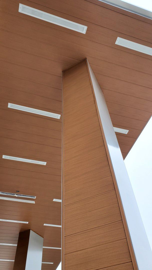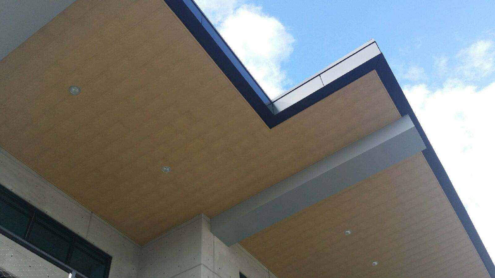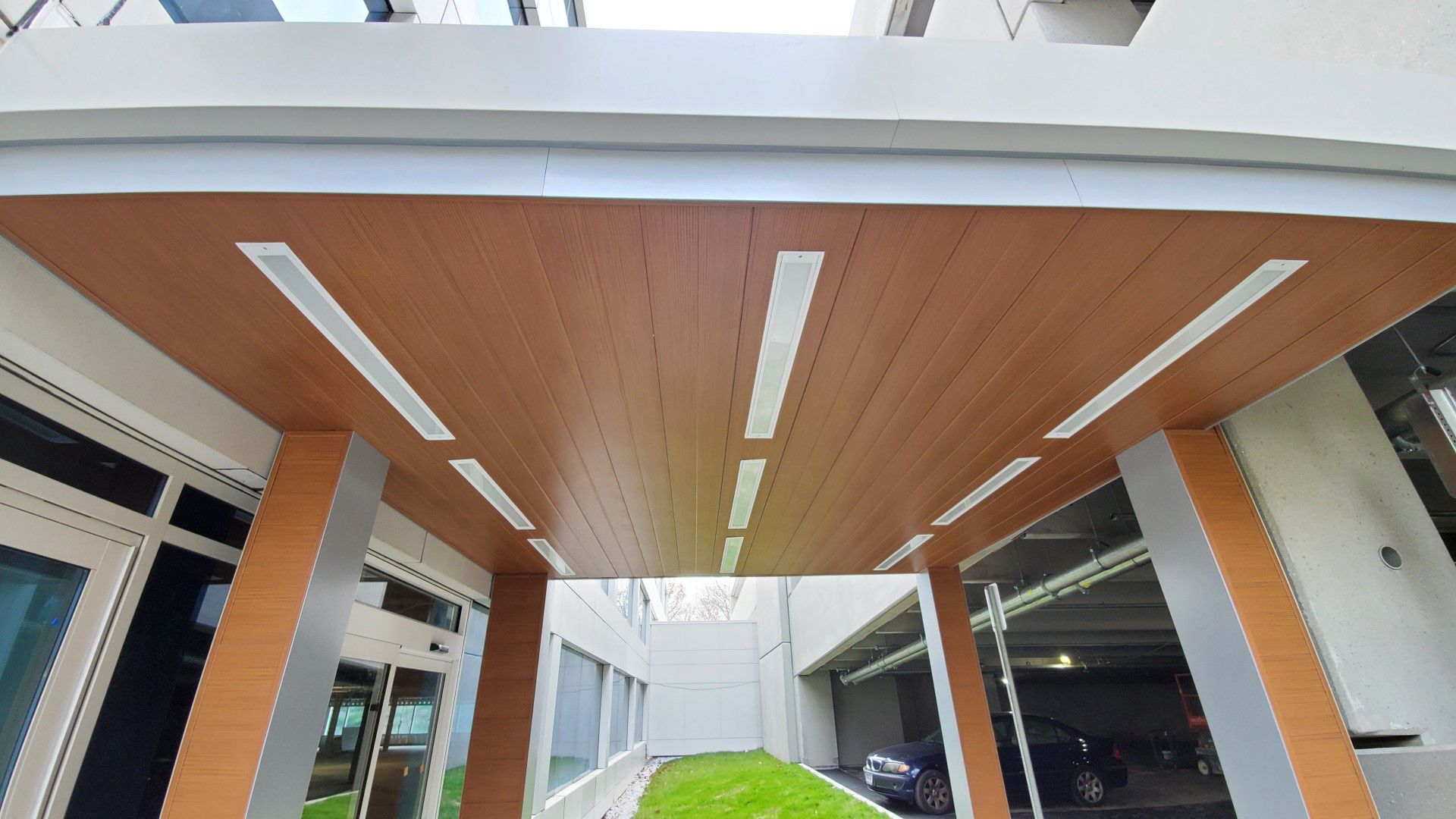 It is always an honor to have our material showcased on an architect’s own office building. Utah’s AE Urbia’s designed their new offices with bold blocks of material. The building’s raw cast concrete walls support the dramatic canopy and provide a rich contrast to the “TimberMet” finish. OCM provided a custom color wood grain finish from our “TimberMet” series and Western Building Group fabricated the soffit panels.