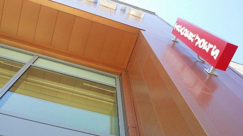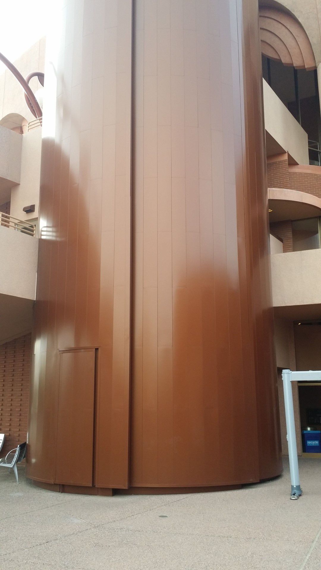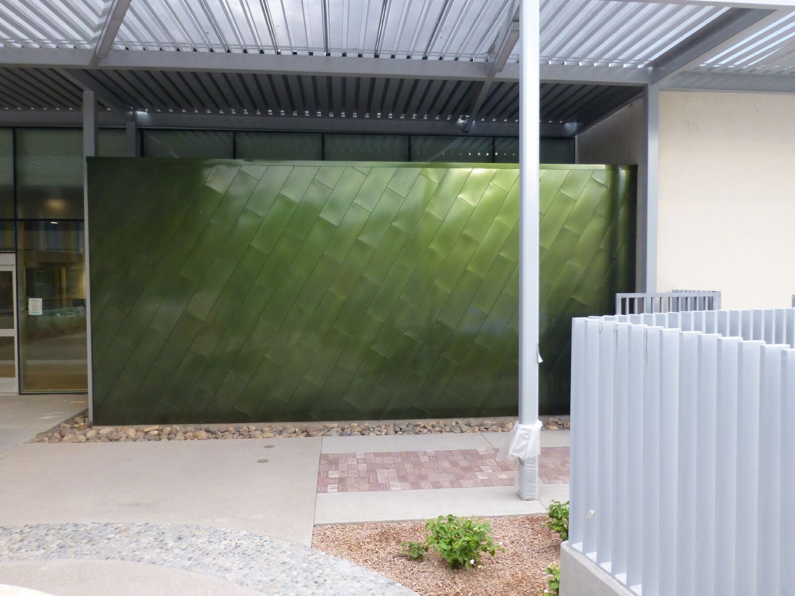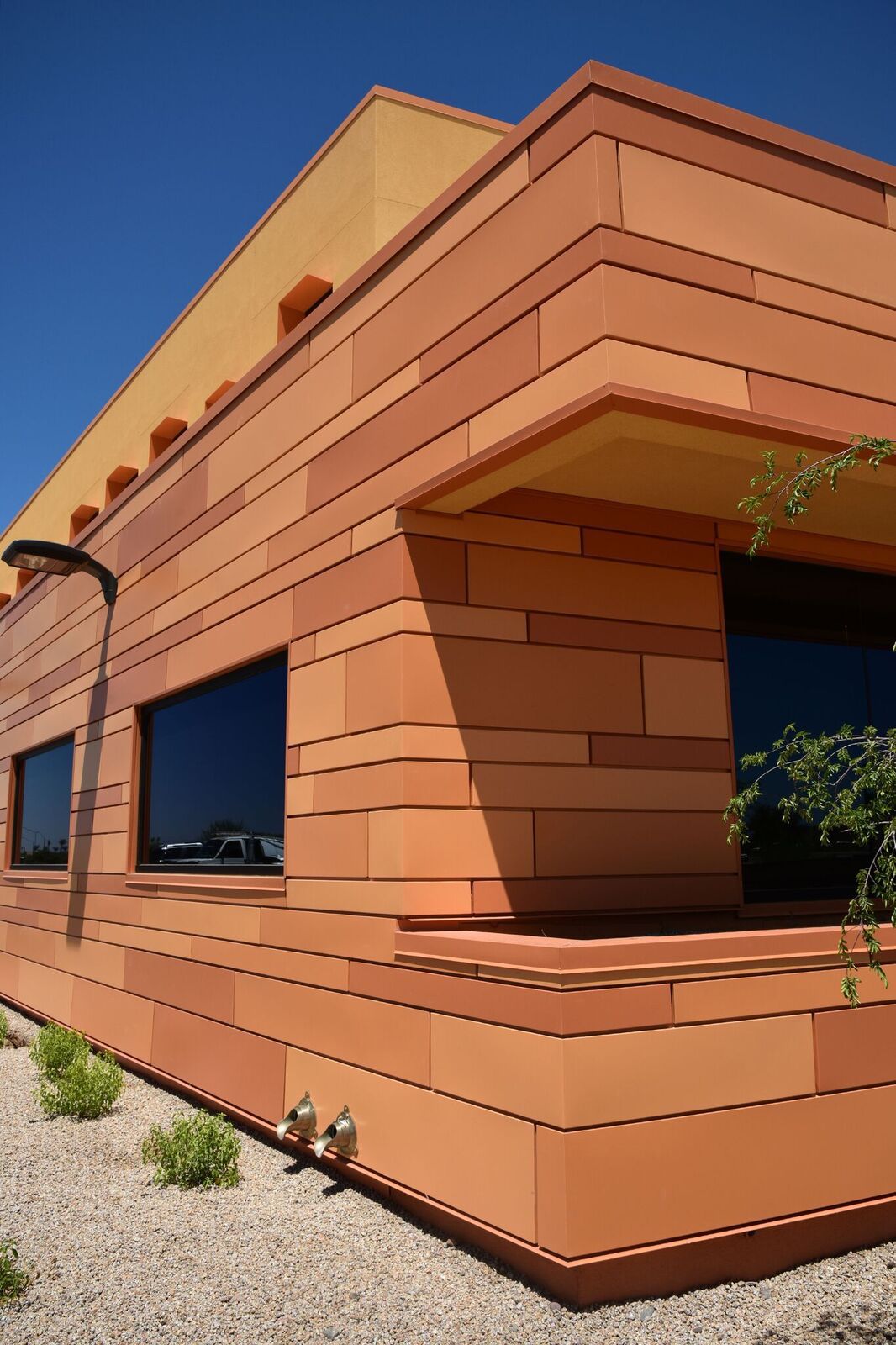 This highway rest stop in the Arizona desert had the original copper panels stolen from the building. When the state replaced the panels they wanted to keep the original look of the aged copper panels, while discouraging repeated theft. Working with the client, OCM developed a custom PVDF print finish, now known as OCM’s “K5 Dark Patina Copper”, to replicate the appearance of the original panels in harmony with the colors of the surrounding environment.