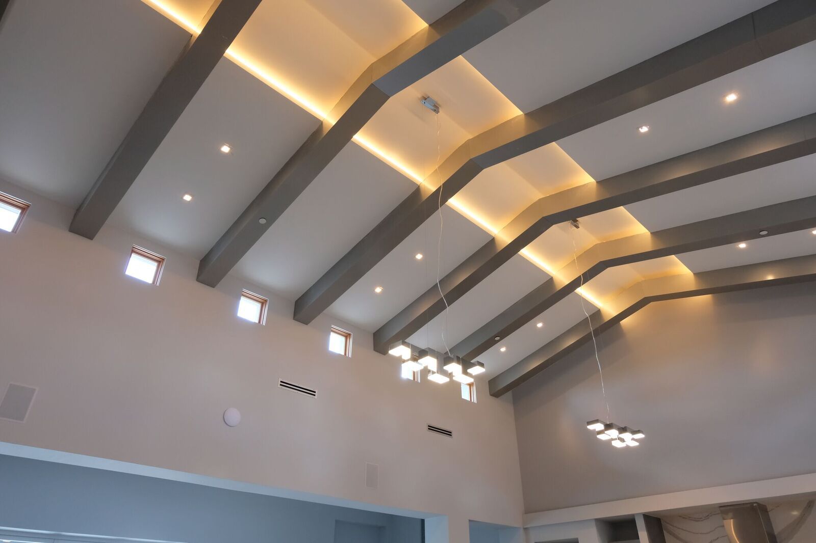 OCM Coil supplied Paul Rich Roofing with custom K5 rust-printed finish materials to fabricate the standing seam roof at a private residence down in Scottsdale, AZ. The colors had to be customized to meet the HOA's color palette requirements. Silver Ore was used for the soffits on the outdoor patios and to clad the beams in the high ceilings of the great room, and Black Ore for the custom garage doors.