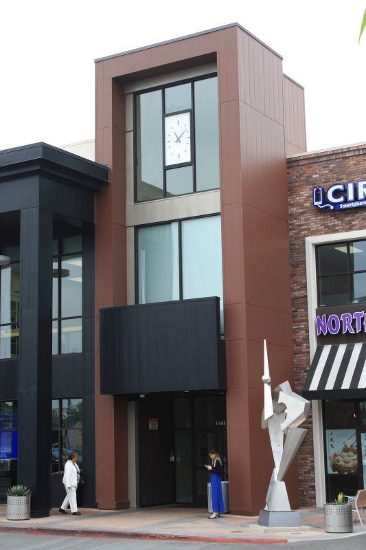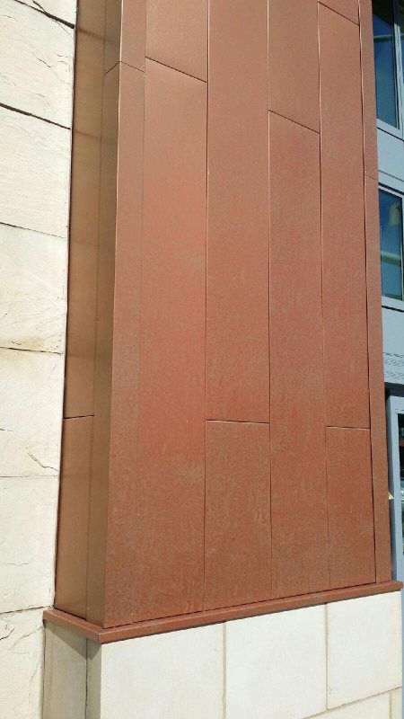 OCM’s K5 – Rustico was used to clad the iconic clock tower, which is the centerpiece of this Southern California shopping center. While the painted metal provides the look of rusted metal, there is no rust staining of surrounding materials. The K5 – Rustico finish is the perfect bridge between the natural, rustic stone and the more modern, black painted metal panels that make up the rest of the façade.