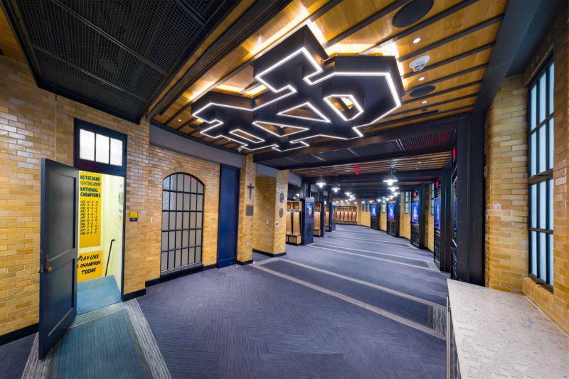 OCM worked with the architect and fabricator to develop a custom finish that would replicate the official color coordination of the University of Notre Dame Football. At the request of the designer for the project (Integrated Design Solutions) we matched the classic Notre Dame navy blue color. Various historic NCAA college football programs recently updated their facilities, and OCM was proud to be a part of this process. OCM provided the materials to Oakland Metal Sales to fabricate the custom panels for the flat screen TVs in the facility.