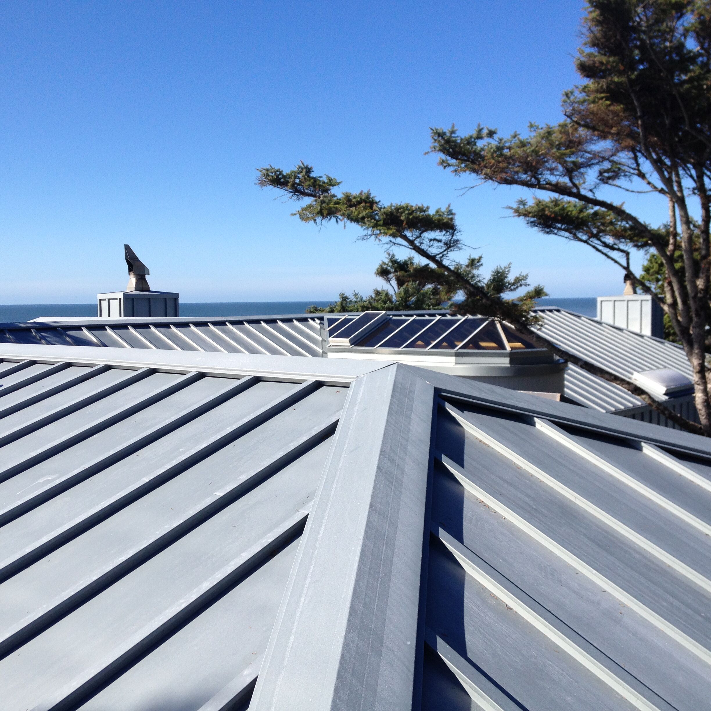 TT L was contracted to replace the zinc roof with RHEINZINK, and to provide a roofing assembly that would allow the zinc to perform optimally in this extreme environment for this private beachfront residence in Cape Arch, OR. The owner had previously installed another zinc roof that failed due to flaws in the roofing assembly and installation. While RHEINZINK will weather rapidly in such a humid and salt-laden environment, the patina develops as a protective crust that will preserve the material for many decades when installed properly.
